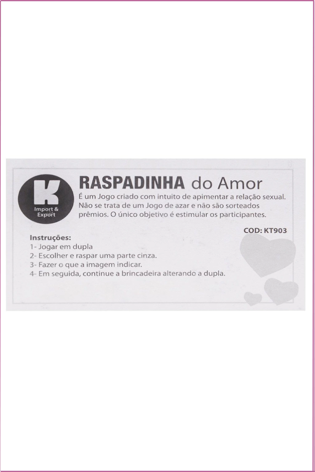 Se você deseja inovar e intensificar a intimidade no relacionamento, a Raspadinha do Amor Kgel é a escolha perfeita. Além de ser um presente romântico, é ideal para complementar a compra de outros produtos íntimos, tornando seus momentos a dois ainda mais especiais, divertidos e apaixonantes.